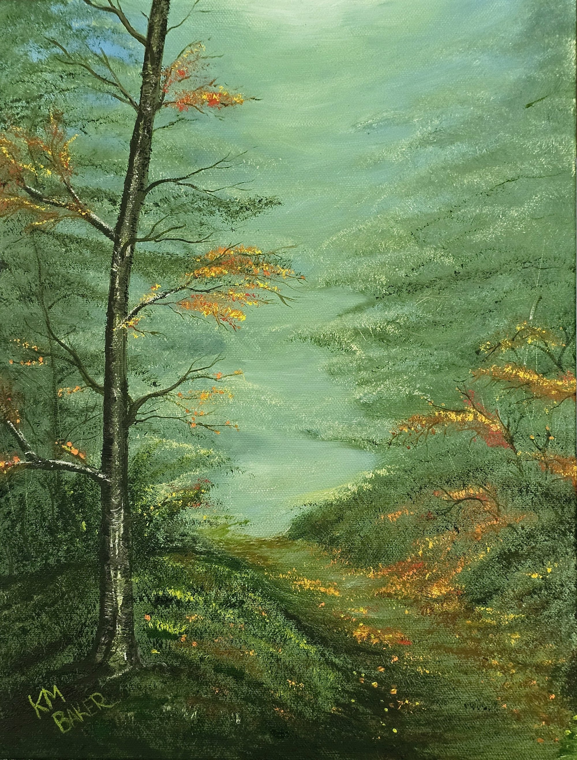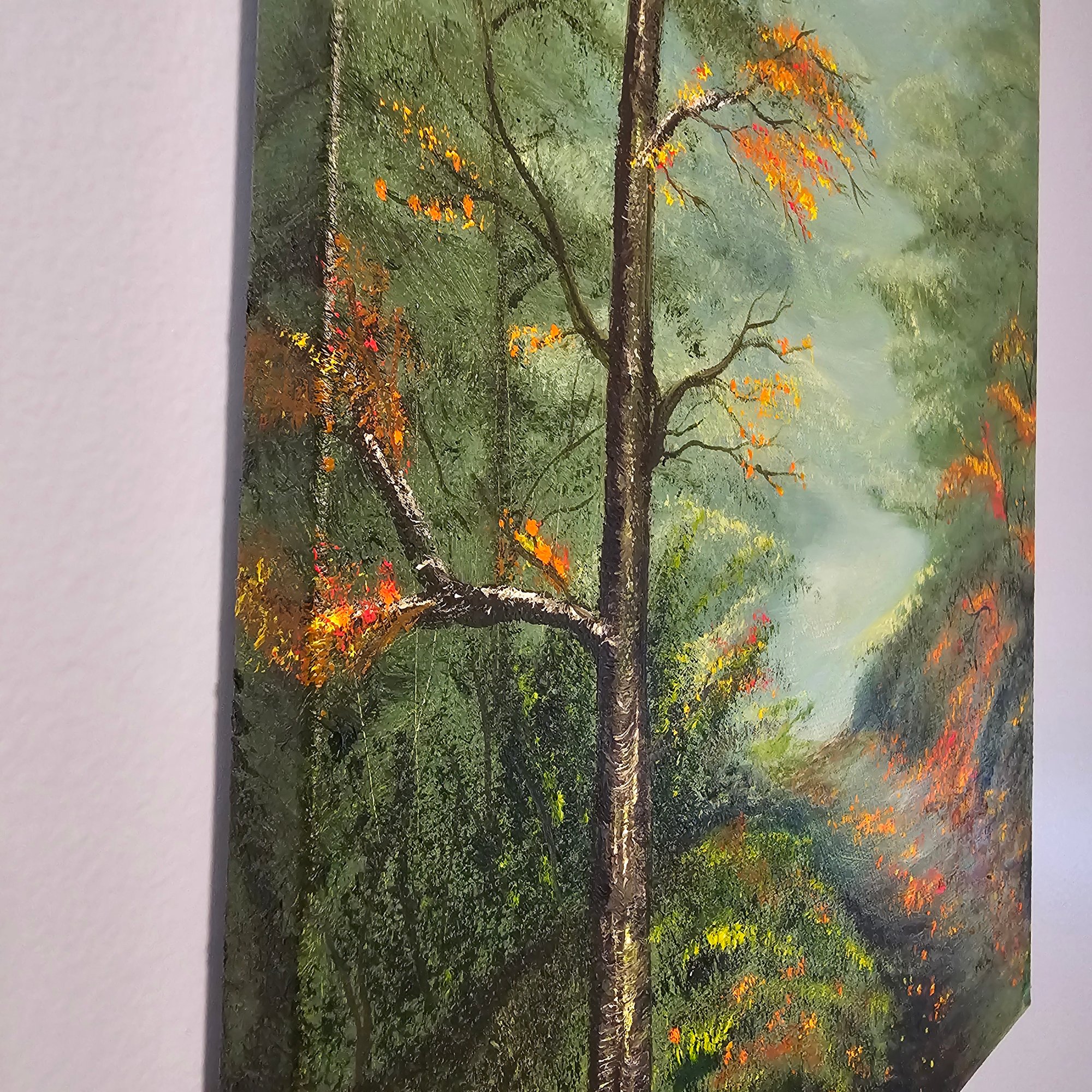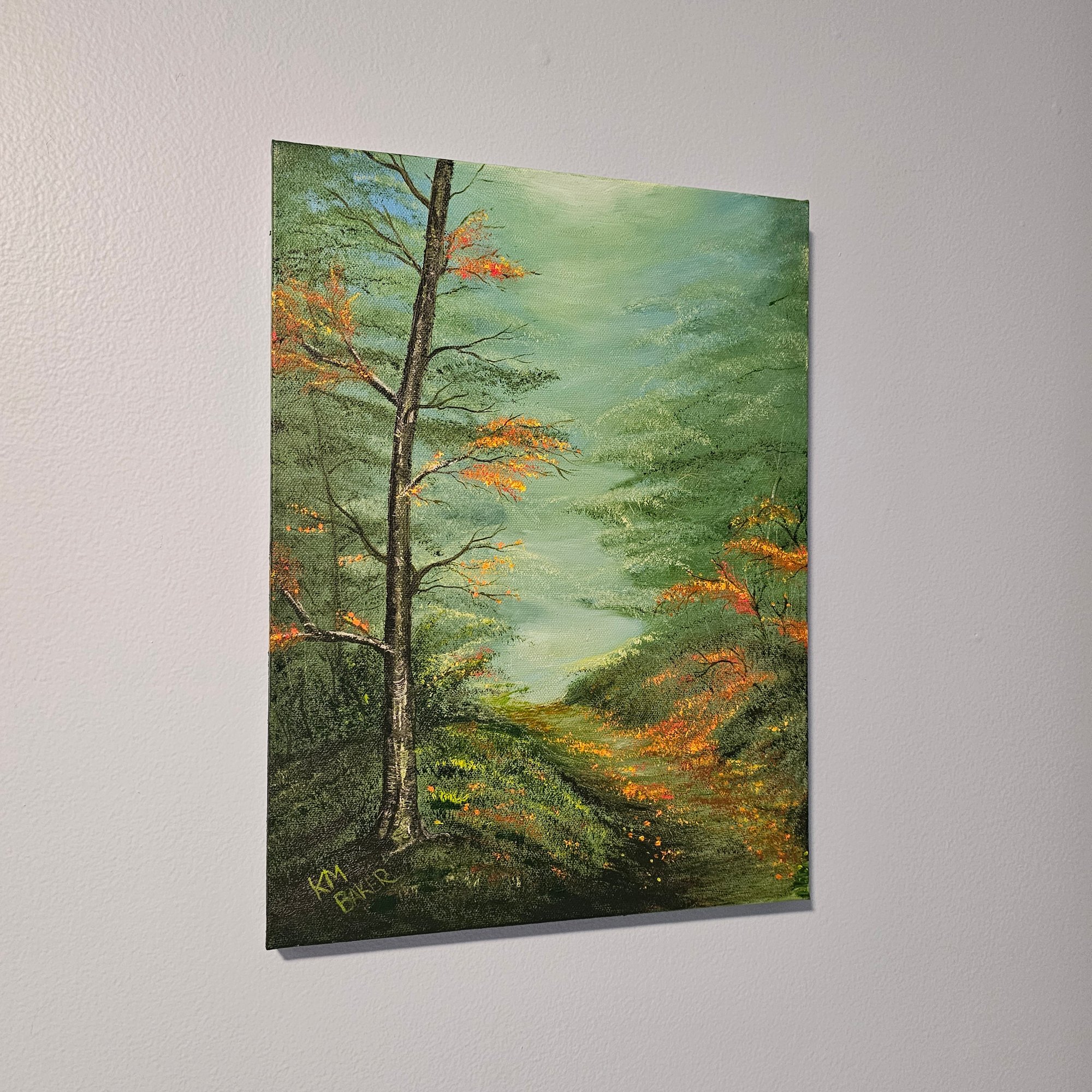 Bring the quiet beauty of early autumn into your space with this original oil painting by artist KM Baker. A peaceful woodland path through lush greenery, as the golden leaves of fall appear on a tree in the foreground—signaling the change of seasons. Painted on a 12"x16" stretched canvas with finished edges, this piece is ready to hang and enjoy. A perfect blend of summer’s life and autumn’s promise.